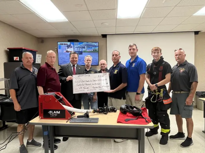 Sep 14 2025: Legislator Tom McKevitt present a $65,000 grant to the East Meadow Fire Department for the purchase of the FLAIM FTS mixed reality firefighter training system. Left to right: EMFD Ex-Chief James J. Kane; Chairman of the EMFD Board of Commissioners John J. Priest; Nassau County Legislator Tom McKevitt: Commissioner Keith J. Hoffman; Commissioner Carey A. Welt; Chief of Department Michael J. Wood; First Assistant Chief Kurt Becker; Firefighter Joseph D’Alessandro and Ex-Chief Philip Fertitta.